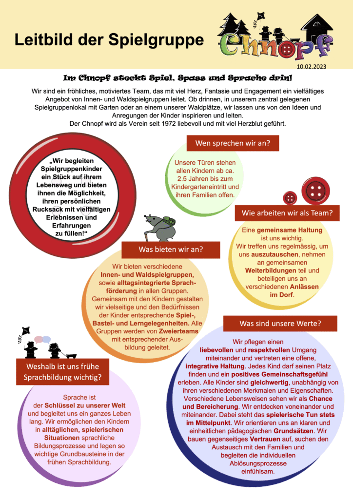 Der „Orientierungsrahmen für Frühkindliche Erziehung, Betreuung und Bildung in der Schweiz“ ist 2012 entstanden und bietet in drei Landessprachen eine fundierte pädagogische Grundlage für die Begleitung der Entwicklung von Kindern zwischen 0 und 4 Jahren. Er ist die Basis für die pädagogische Arbeit in der Spielgruppe Chnopf.