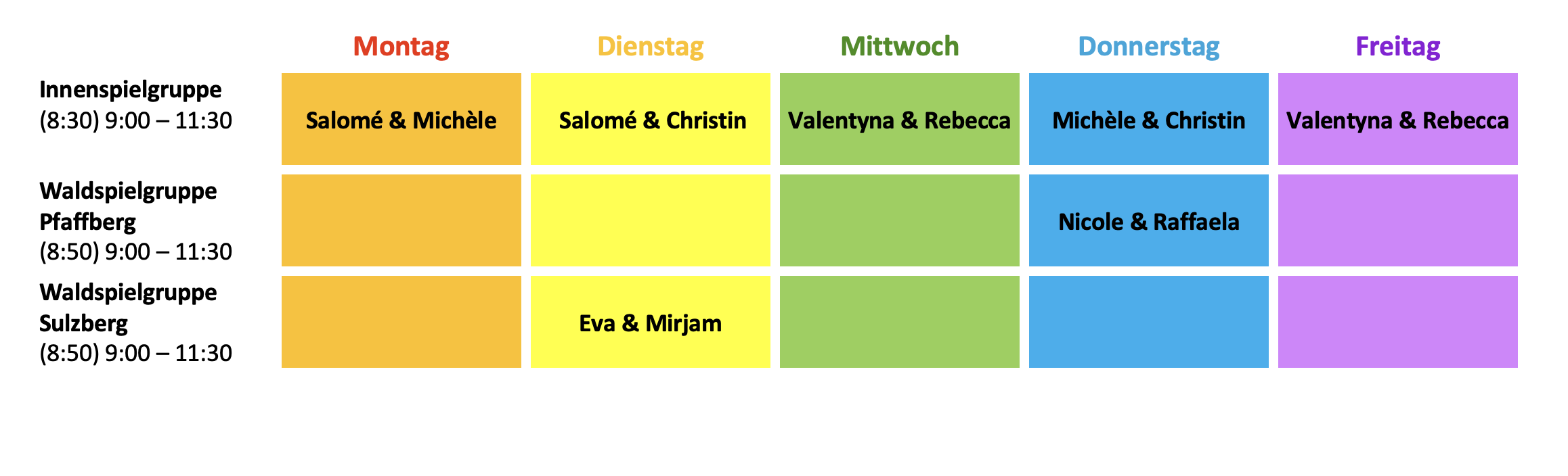 Spielgruppenmorgen, welche auf Feiertage oder schulfreie Tage (z.B. Märt, Fasnacht) fallen, werden nicht nachgeholt oder rückvergütet.